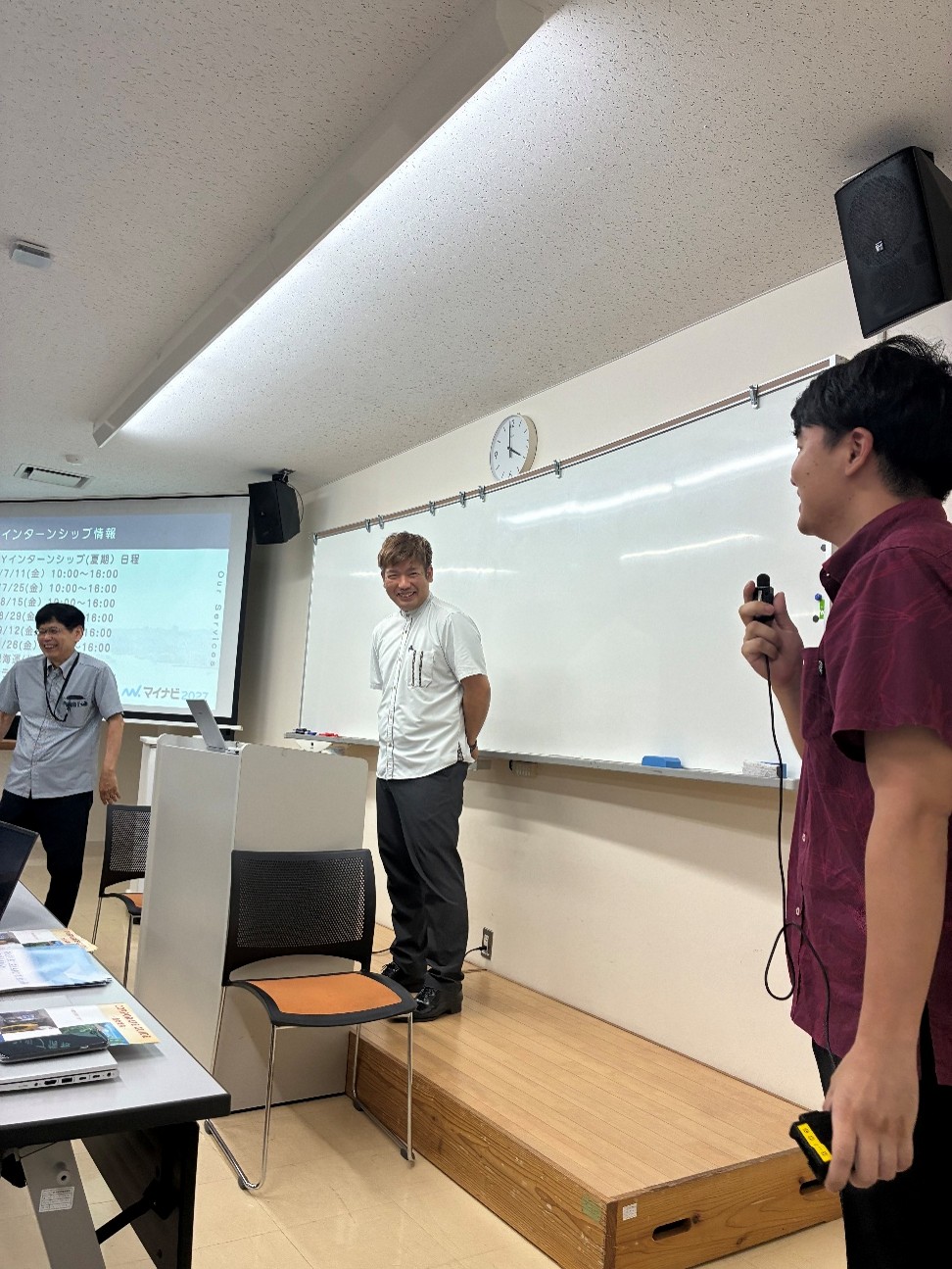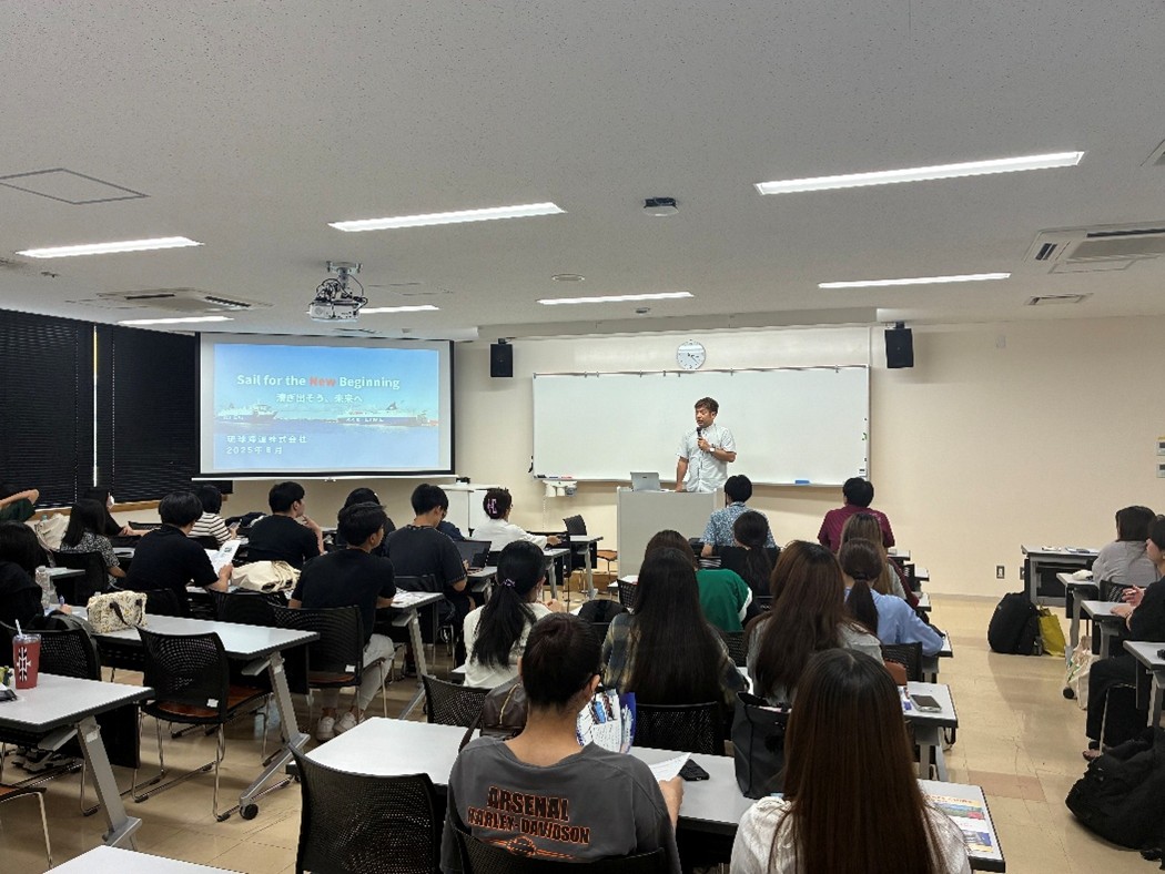7/2(火)、沖縄国際大学の講義「インターンシップ入門」にて、総務部の新城課長より、当社の会社紹介と海運業・物流について講義を行いました。