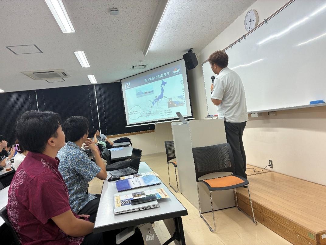 講義では、インフラである物流や海運業の重要性について、台風時の事例や沖縄県の物流事情を踏まえながら説明が行われました。