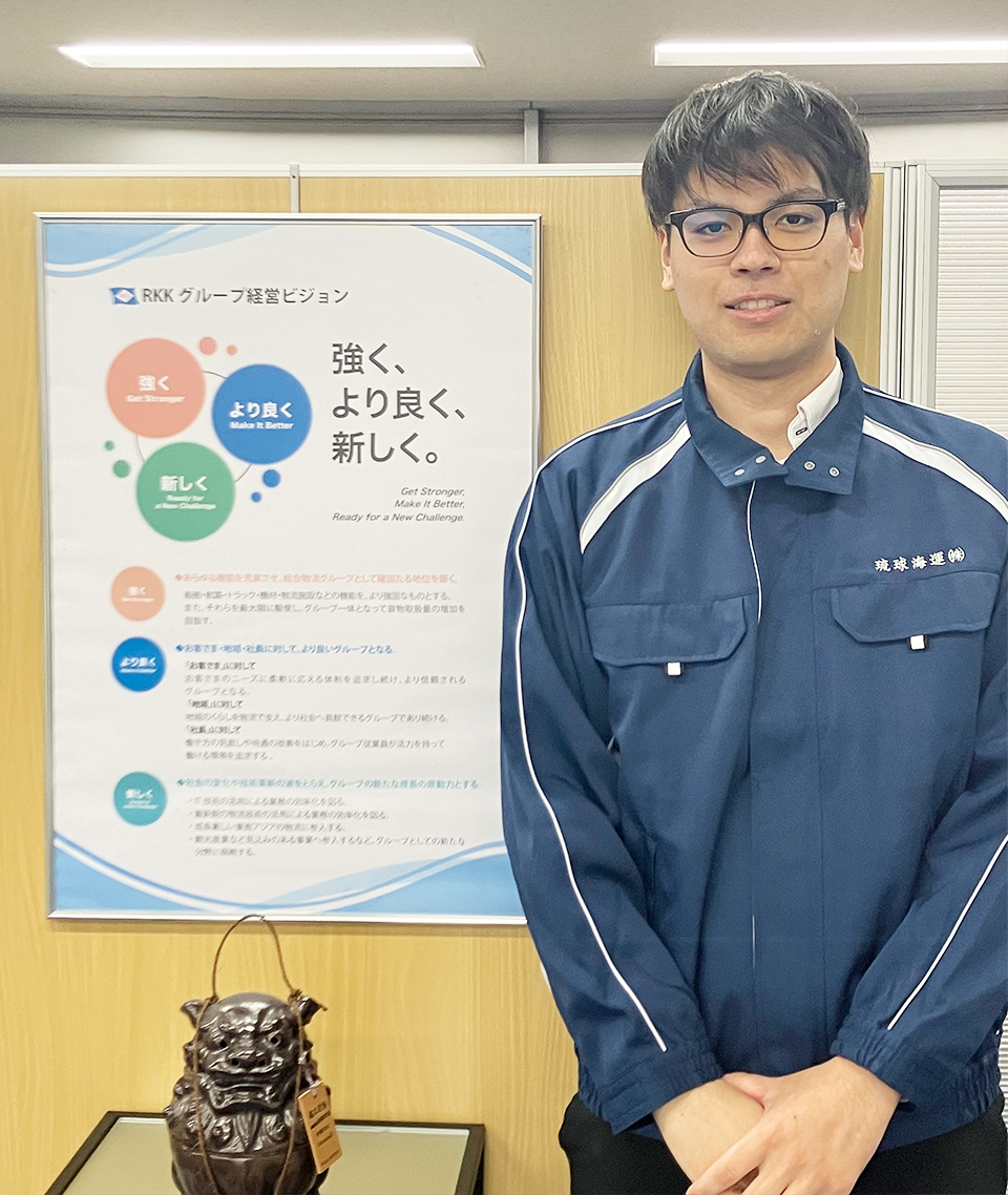 もともと地元の沖縄に貢献できる仕事ができる仕事がしたいと考えていました。沖縄へ貢献できる仕事はたくさんありますが、その中で琉球海運の会社説明会に参加して、海で囲まれた沖縄で消費される様々な物品をどんなものでも運んでおり、沖縄の経済・生活の核であるという説明を聞いて、とても魅力を感じました。それまで沖縄の物流というものをあまり考えていませんでしたが、よく考えれば、県内で生産できるものは限られており、沖縄で消費している多くのものが船で運ばれているということに気づき、その貢献度の高さを知って入社を志望しました。