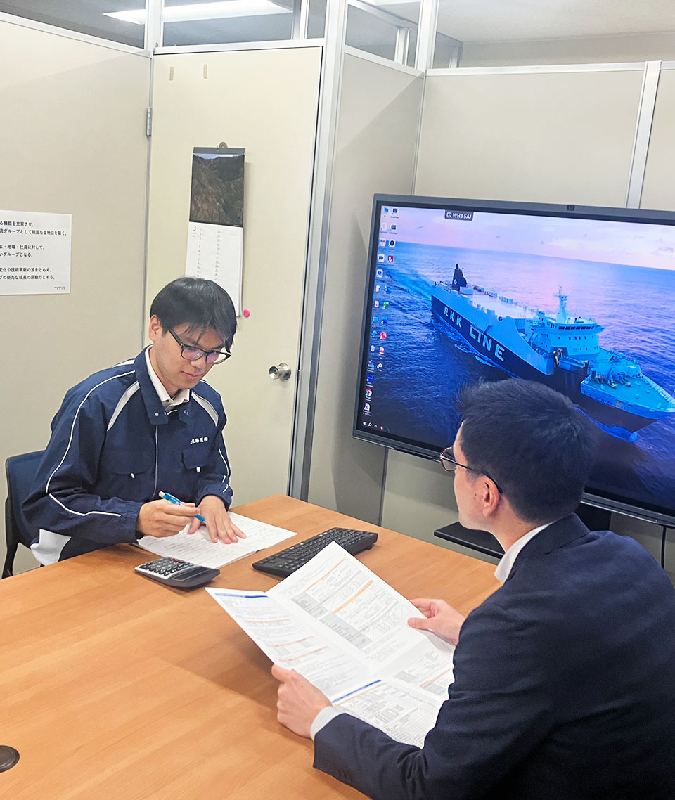 私が所属しているのは福岡支店です。支店の業務としては、船のブッキング業務および現場立ち会い、お客様への営業活動や問い合わせの対応、そのほか支店内の総務や経理といった業務があります。週6便福岡から船が出るので、船ごとに担当者で当番を組んでブッキング業務を行います。担当はその日一隻に積む貨物を任される非常に責任がある仕事であり、スケジュールの調整や現場指揮監督との打ち合わせ、お客様との搬入時間の確認などし、必要に応じて各所への確認や指示を出したりしなければならない仕事でその一隻に関わる仕事すべて行わなければなりません。その分、無事出港できたら達成感も大きいです。